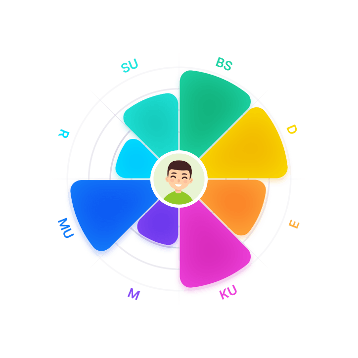Die visuelle Darstellung macht individuelle Entwicklungen sichtbar und zeigt auf einen Blick, wo Stärken und Förderbedarf liegen – je größer das Blatt, desto stärker die Leistung.